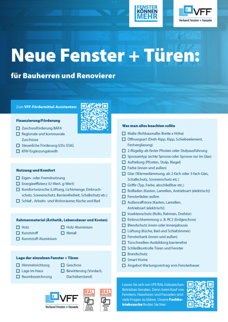 Finanzierung, Rahmenmaterial, Ausstattung – es gibt viele Dinge, die Sie bei der Erneuerung von Fenstern und Türen beachten sollten. Mit unserer Checkliste können Sie sich einen Überblick verschaffen.